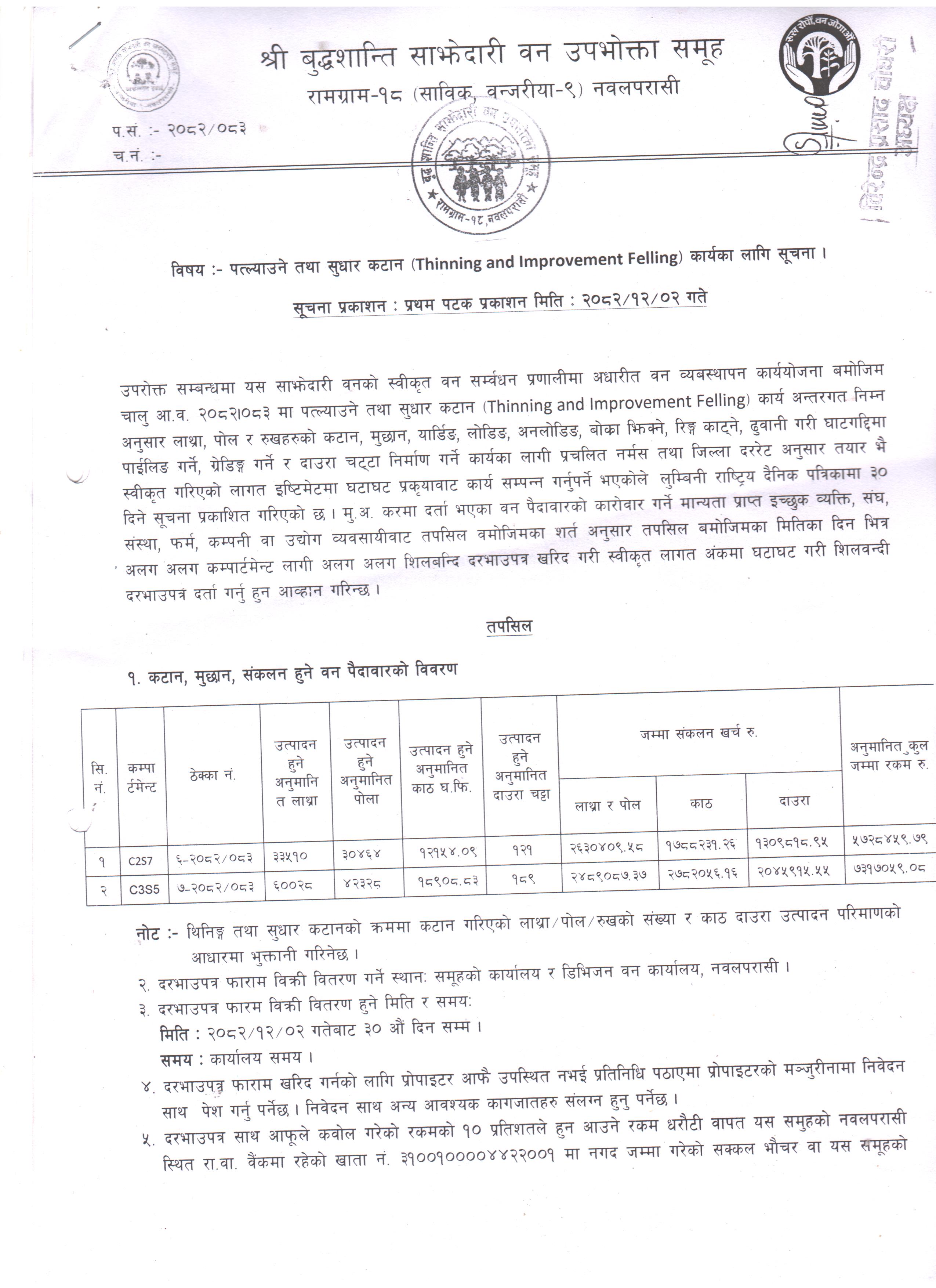 बुद्धशान्ति साझेदारी वनको थिनिङ्ग तथा सुधार कटान सम्बन्धी सुचना पहिलो पाना